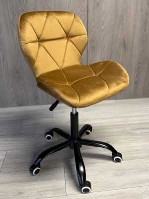 Сучасний поворотний стілець, оббитий кольоровим оксамитом коричневого кольору зі стьобаним малюнком на спинці на чорній основі.