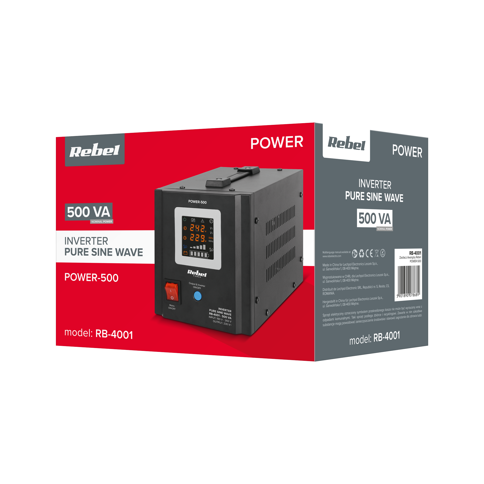 Комфортне використання джерела безперебійного живлення Rebel гарантує чіткий світлодіодний дисплей. Завдяки цьому ви можете легко прочитати поточний робочий стан пристрою, перевірити, серед іншого: вхідна напруга, вихідна напруга та частота. Крім того, ви можете швидко перевірити рівень навантаження та рівень заряду батареї.