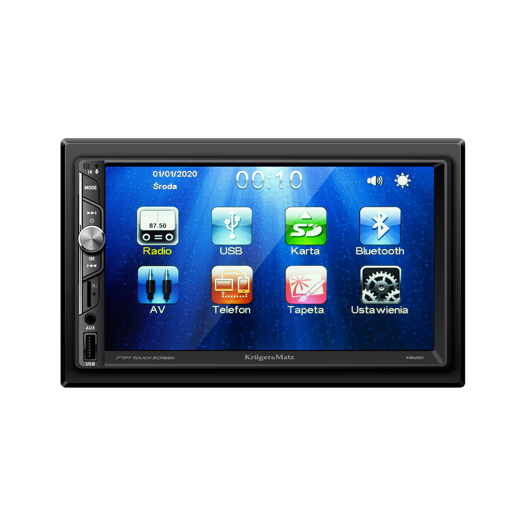 Автомобільна радіостанція Kruger & Matz KM 2007 надає вам широкий спектр можливостей, коли справа доходить до вибору джерела звуку та відео. Окрім функції Bluetooth, у вас є порт UBS, роз’єм AUX і пристрій для читання карт пам’яті.