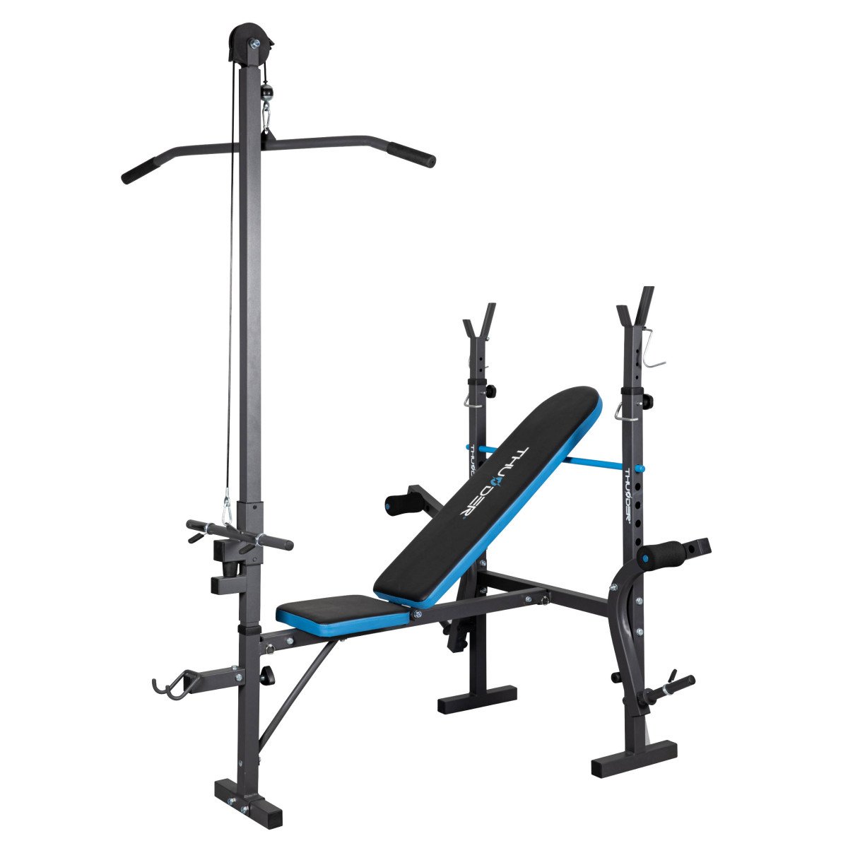 Він також оснащений верхнім блоком, який ідеально підходить для тренування м’язів спини і заднього плеча.