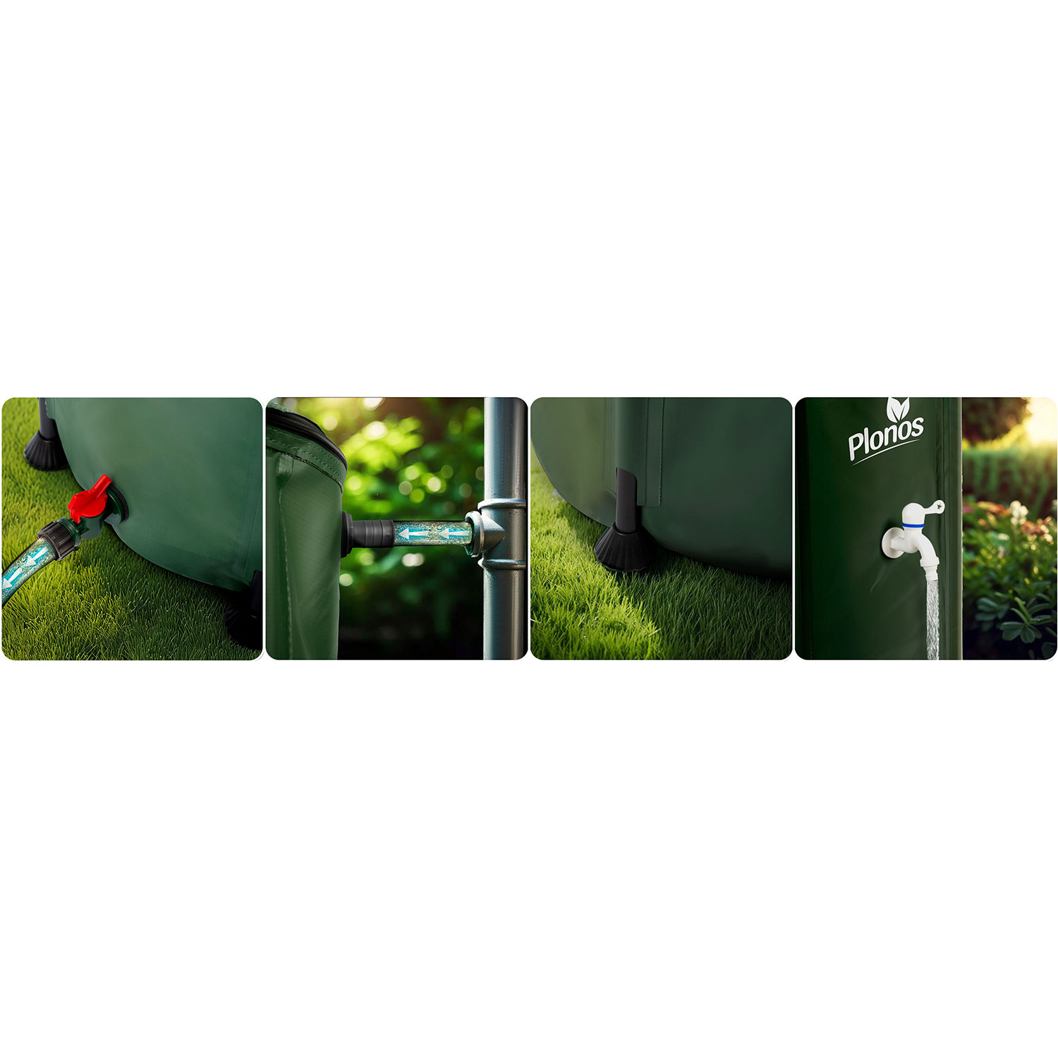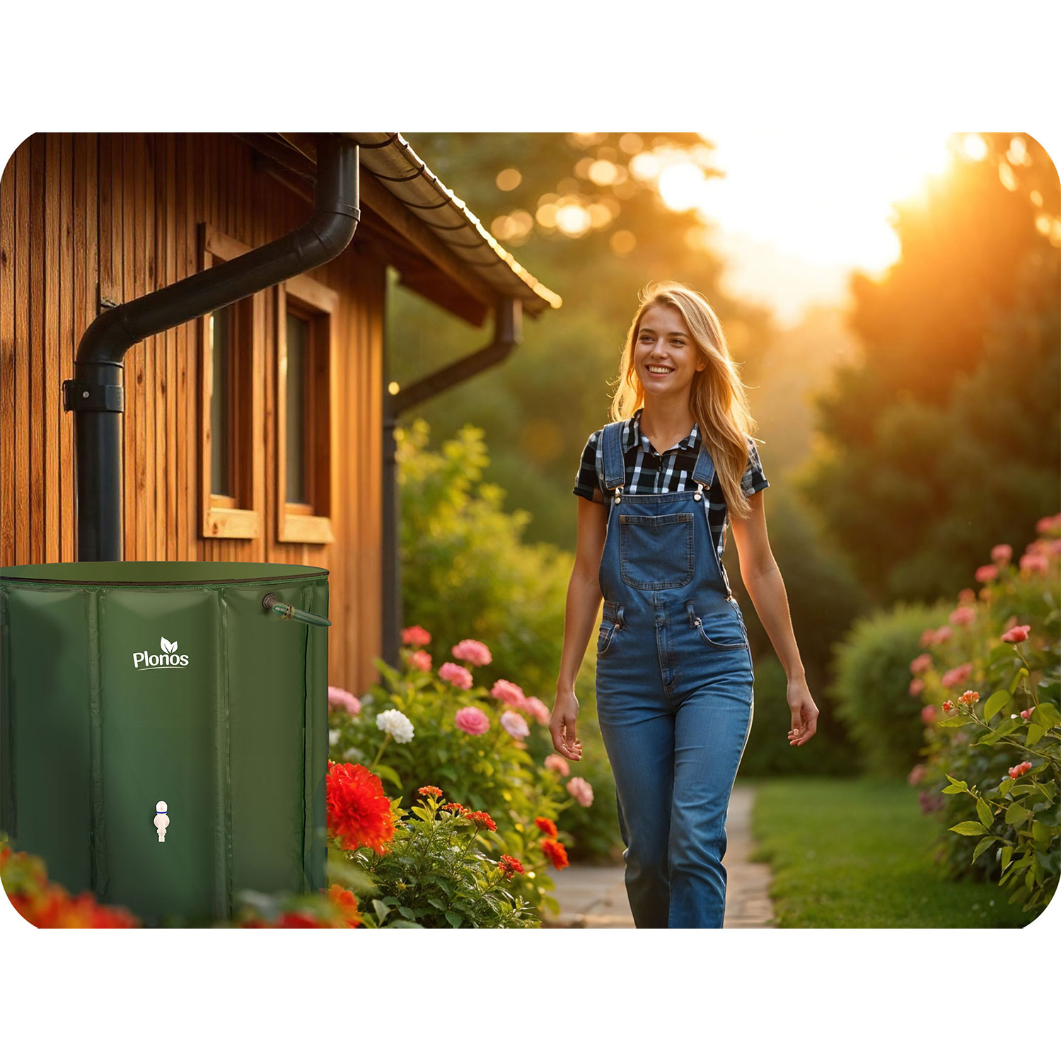 До збірника можна легко підключити садовий шланг, що дозволяє зручно поливати грядки, газон або рослини в теплиці. Це забезпечує легкий доступ до дощової води по всьому саду, економлячи час та зусилля.