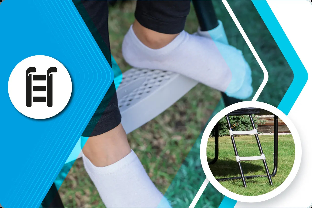 Драбина на батуті забезпечують безпечний вхід та вихід завдяки рельєфним сходам. Спеціально профільовані протиковзкі сходинки підвищують стійкість та безпеку користувачів, особливо дітей.