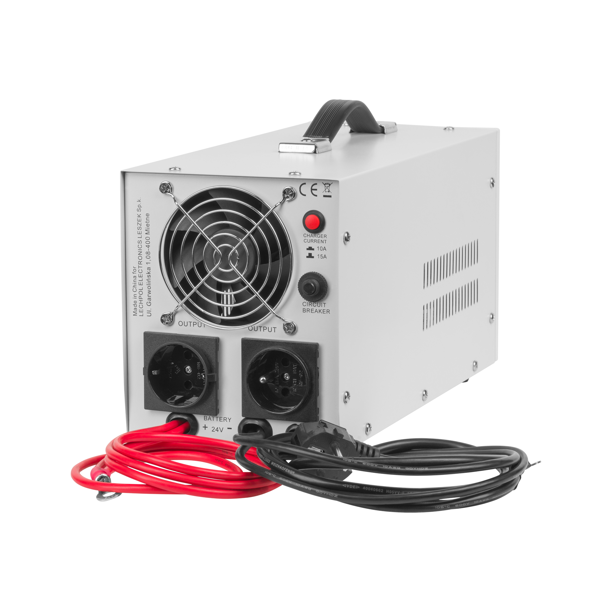 з функцією заряджання перетворює напругу 24 В постійного струму, що подається від зовнішньої батареї, на напругу 230 В змінного струму та заряджає зовнішню батарею.