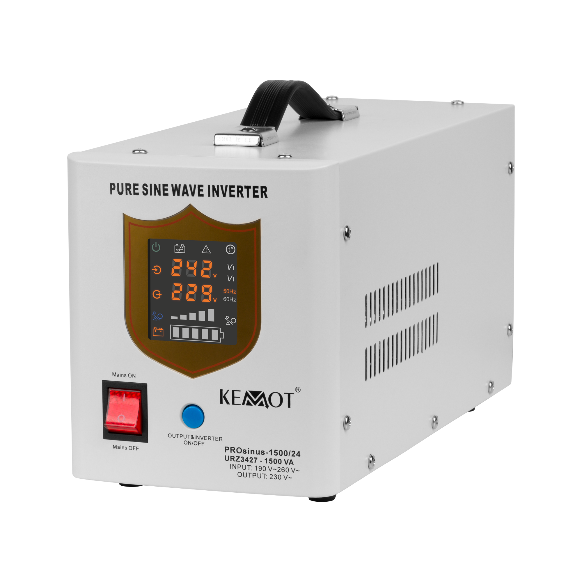 Аварійні джерела живлення KEMOT PROSinus оснащені чітким світлодіодним дисплеєм, який відображає поточний робочий стан пристрою. На дисплеї ви можете перевірити, серед іншого: вхідна напруга, вихідна напруга та частота. Крім того, ви можете швидко перевірити рівень навантаження та рівень заряду батареї.