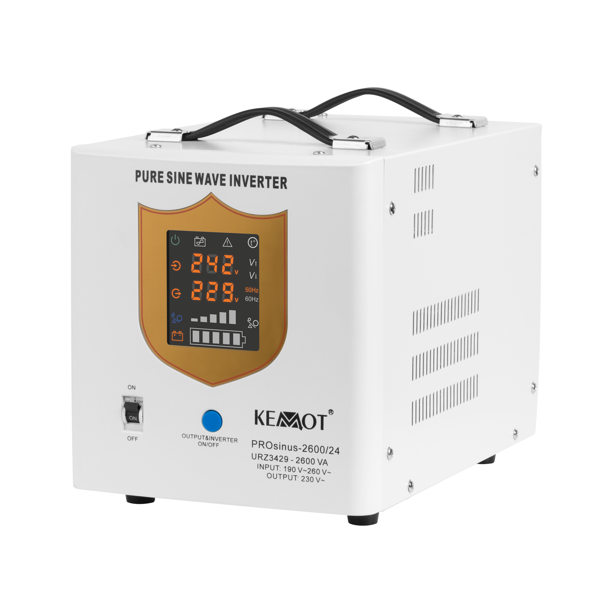 Аварійні джерела живлення KEMOT PROSinus оснащені чітким світлодіодним дисплеєм, який відображає поточний робочий стан пристрою. На дисплеї ви можете перевірити, серед іншого: вхідна напруга, вихідна напруга та частота. Крім того, ви можете швидко перевірити рівень навантаження та рівень заряду батареї