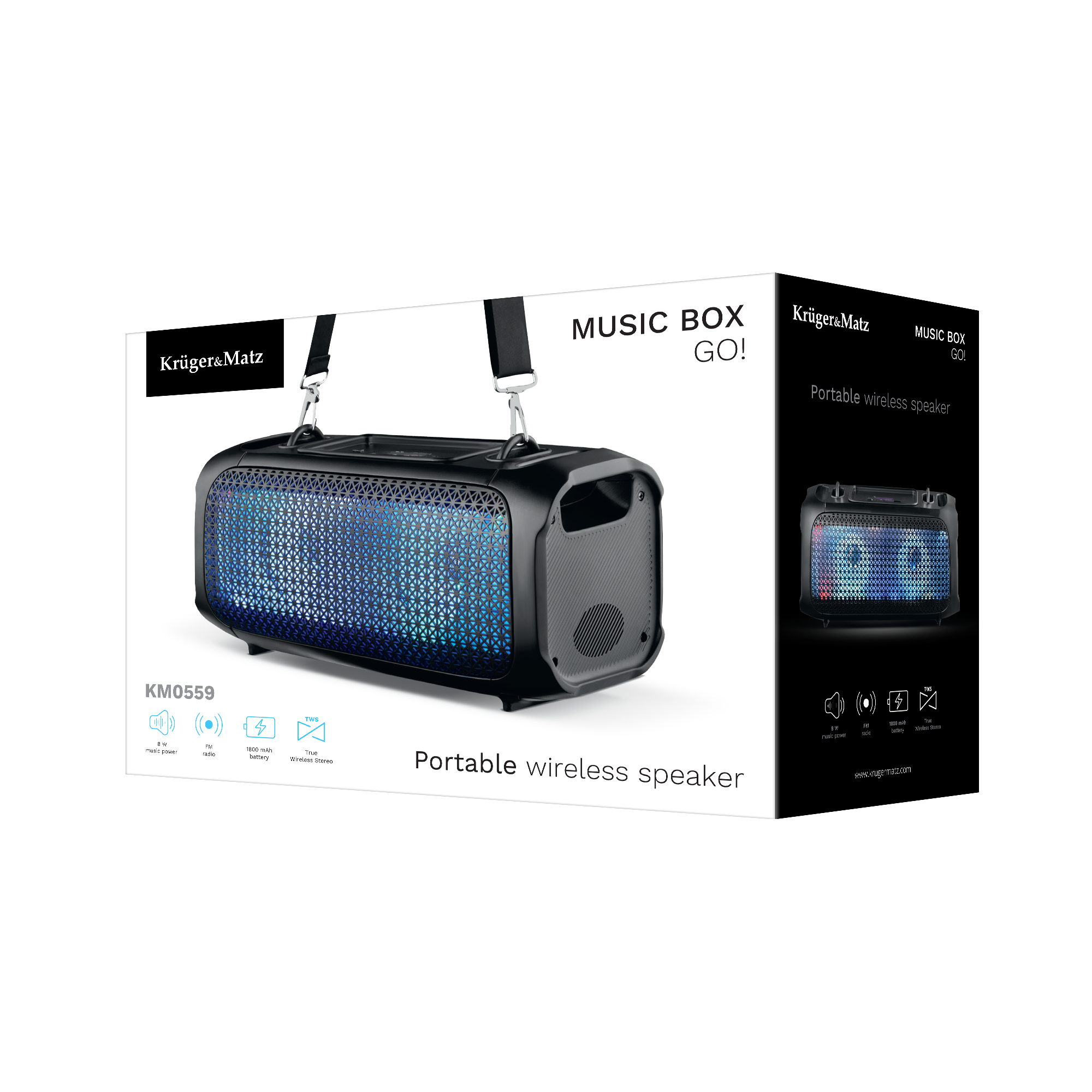 Підберіть правильний гучномовець, який не тільки посилить музичну атмосферу під час зустрічі з друзями, але й зможе перетворити таку зустріч на справжню вечірку. Колонка зі світлодіодами Kruger & Matz Music Box Go! це легке і компактне обладнання, яке ви легко можете взяти з собою на багаття або в гості до друзів. Все завдяки зручному ремінцю, який кріпиться до пристрою.