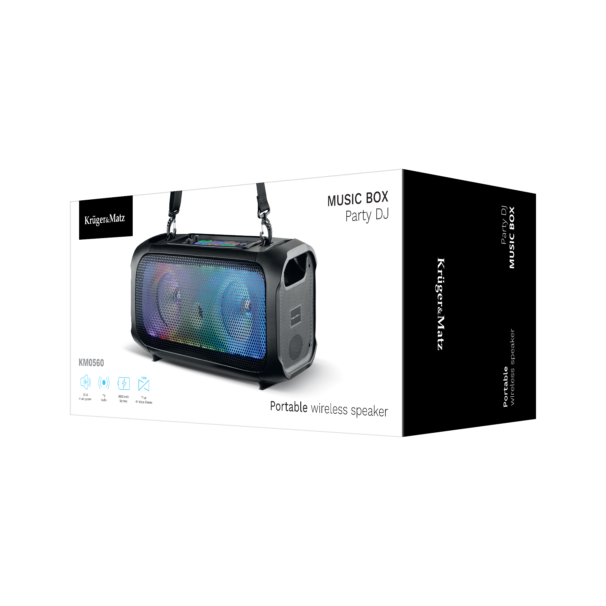 Music Box Party DJ, завдяки технології Bluetooth, ви можете підключитися практично до будь-якого пристрою. Завдяки наявності портів AUX, USB і microSD ви можете слухати улюблений плейлист, збережений на смартфоні, карті пам’яті або флеш-накопичувачі. Music Box Party DJ — це бумбокс із радіоприймачем, тож ви можете легко слухати улюблені станції.