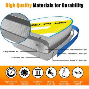 - Міцний високоякісний матеріал: ця плаваюча дошка для веслування виготовлена з подвійних шарів ПВХ, зшитого V-подібними швами для міцності та тривалого терміну служби без деформації та витоку повітря. Алюмінієве весло можна регулювати по висоті відповідно до потреб користувача.