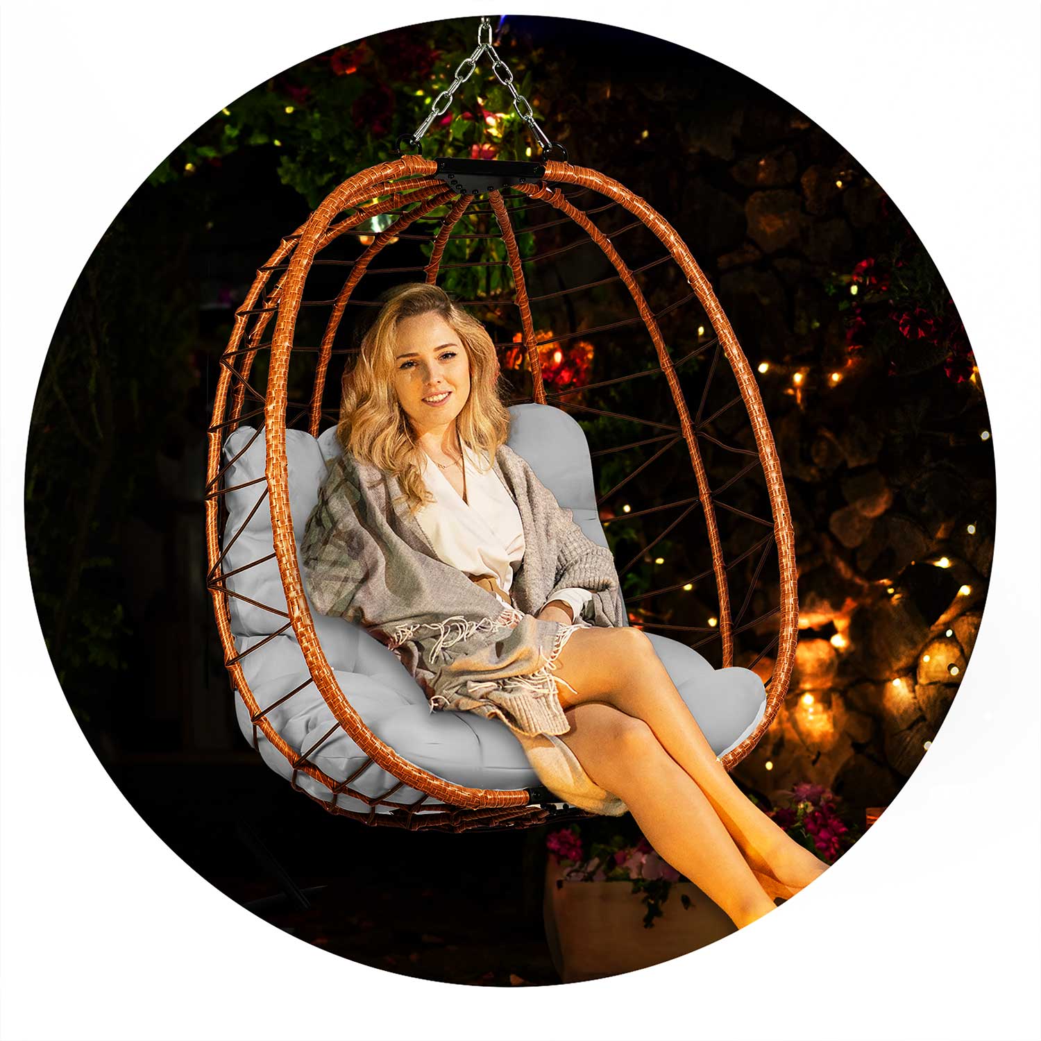 Надійна конструкція – міцний круглий кошик виготовлений із техноротангу, вручну сплетеного на сталевому каркасі.