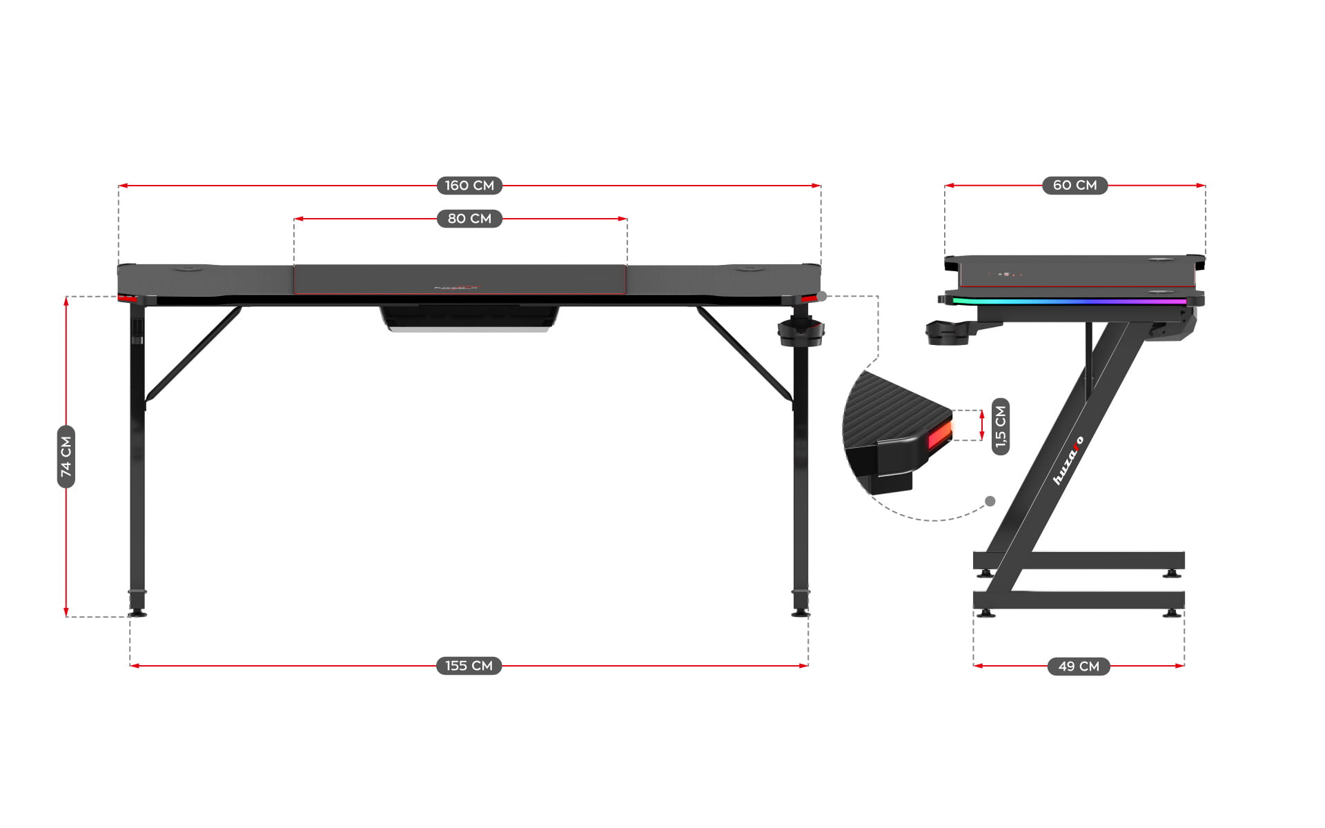Нехай ваш стіл не буде просто нудним предметом меблів. Світлодіодне освітлення RGB перетворить ваш робочий і розважальний простір на надихаючий оазис творчості. Завдяки багатьом колірним режимам ви створите атмосферу, яка відповідає вашому настрою, а стільниця довжиною 160 см задовольнить усі ваші потреби. Комфорт користування столом підвищать килимок XXL, решітка і отвори для кабелів, а також тримачі для навушників і чашки.