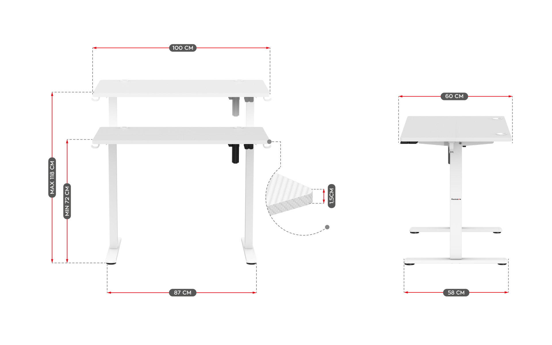 Стіл із регульованою верхньою висотою стане ідеальним компаньйоном для багатогодинних ігор, навчальних марафонів та інтенсивної роботи. Завдяки можливості опускати і піднімати стільницю, ви можете прийняти зручне положення в будь-який момент. Висота столу регулюється від 72 до 118 см, що дозволяє працювати стоячи або сидячи.