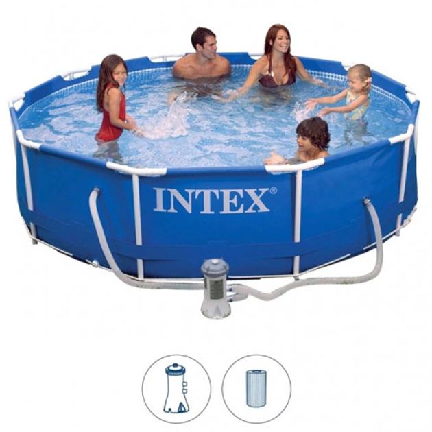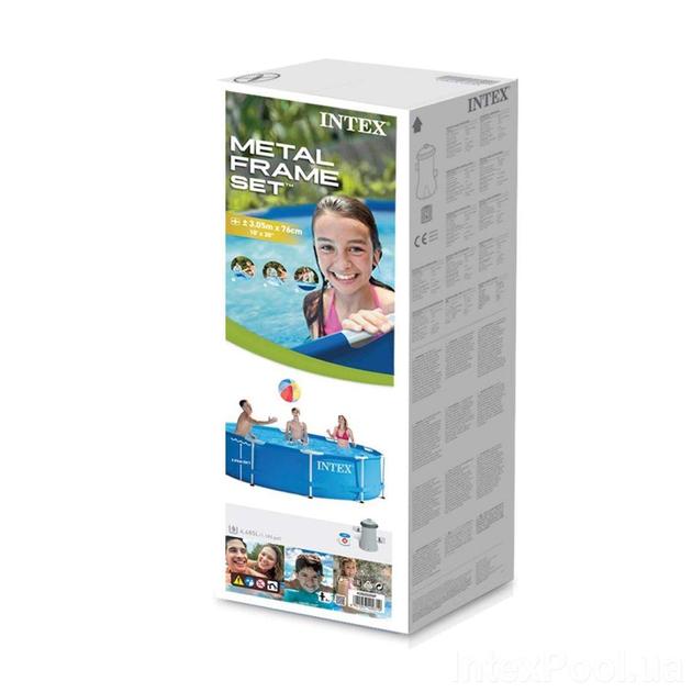 Привабливий круглий басейн (Intex 28202) синього кольору, що гармонує з водою, став популярним у класі середніх басейнів. Він швидко монтується. Каркас складається з міцних труб із цинковим покриттям, захищених від окислення. Для встановлення потрібна очищена горизонтальна ділянка.