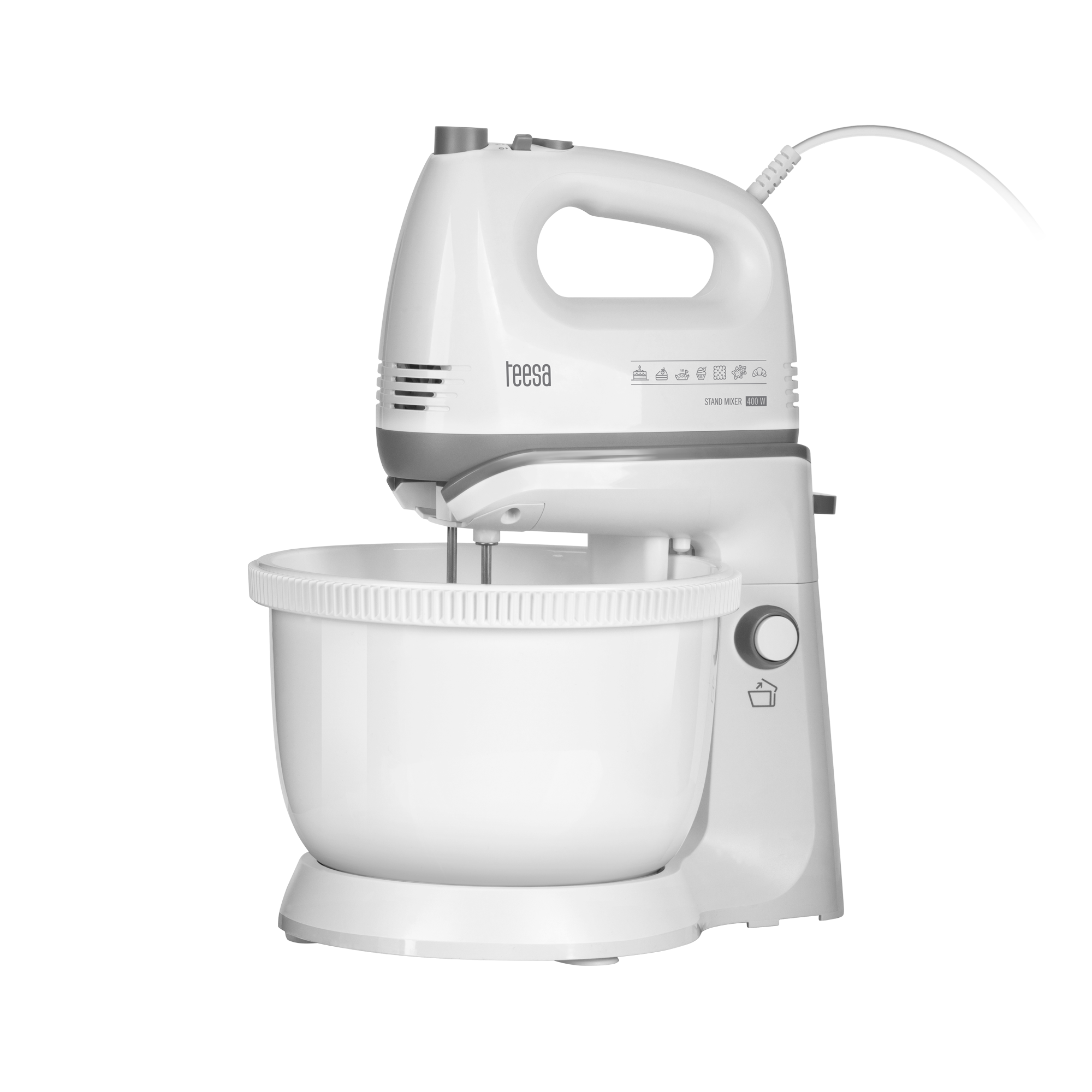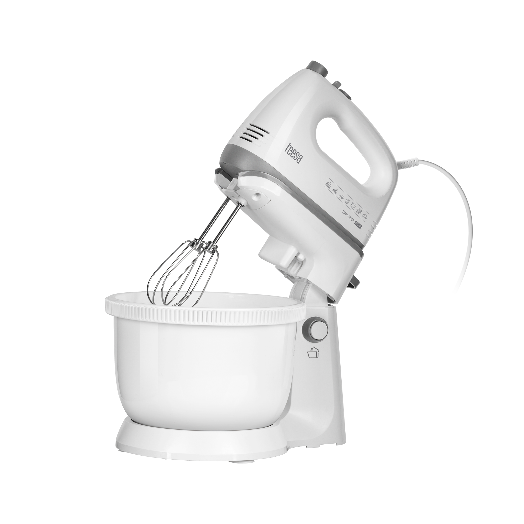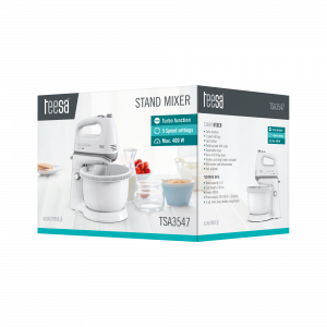 Автоматичний міксер Teesa поставляється зі стійкою обертовою основою з чашею об’ємом 3,4 л. Це дуже зручне рішення, оскільки чаша обертається навколо власної осі і дуже ретельно перемішує всі інгредієнти, що значно полегшує приготування тіста.