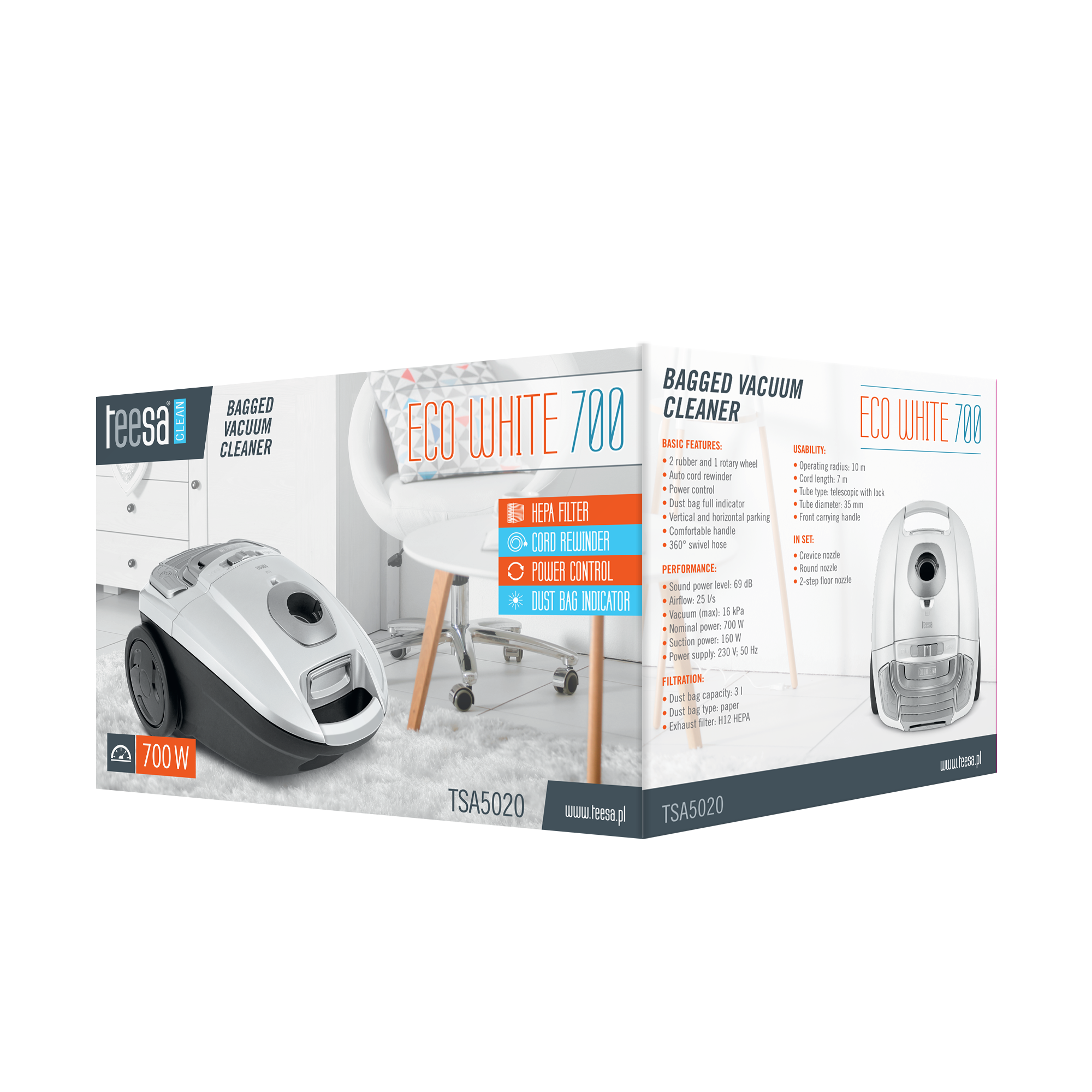Мішковий пилосос ECO WHITE 700 з номінальною потужністю 700 Вт – пристрій, який ідеально підійде для кожного дому. Пилосос надзвичайно тихий, а регульована сила всмоктування означає, що ви можете пилососити будь-які поверхні без будь-яких турбот. 7-метровий шнур живлення забезпечить великий діапазон роботи без необхідності перемикання на іншу розетку.