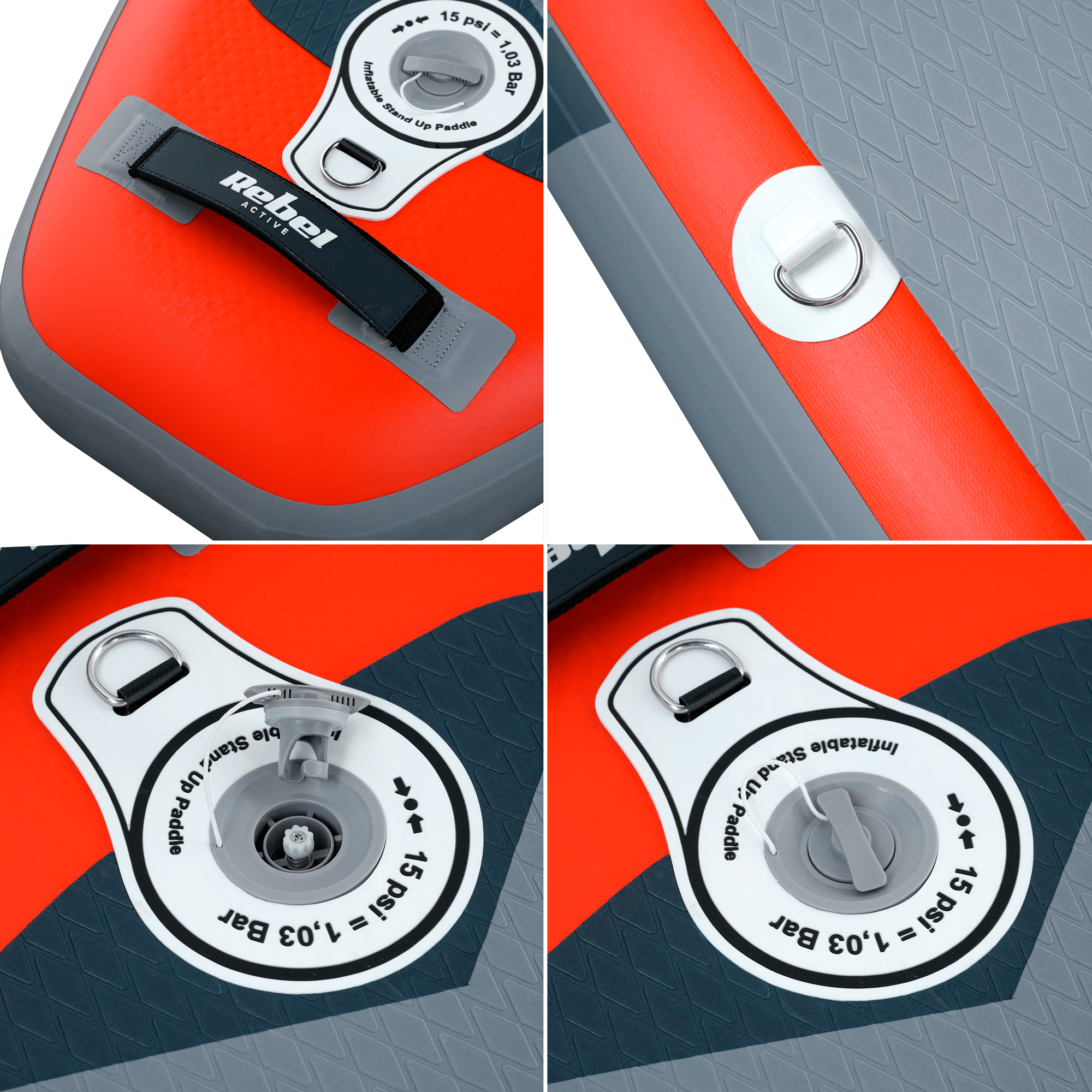 Завдяки двом ручкам для перенесення – центральній та задній – транспортування дошки Rebel Active SUP на березі є легким та зручним. У свою чергу, вбудовані ручки для багажу з кріпильним шнуром на носі дозволяють безпечно переносити необхідні речі під час водних пригод.