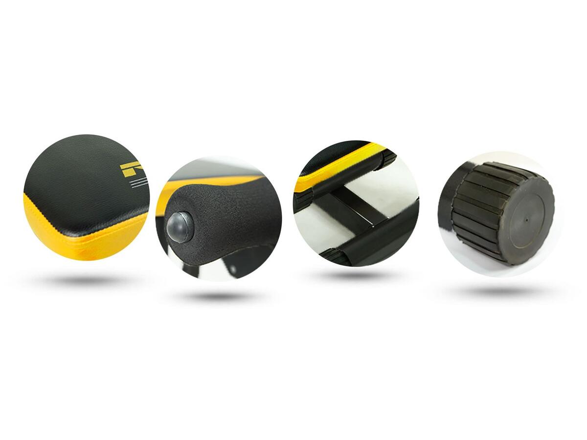 Стійка металева конструкція забезпечує безпеку і максимальну стійкість під час використання лавки. Регулювання висоти ніг дає вам повну свободу адаптувати обладнання до вашого стилю та набору вправ. Завдяки механізму швидкого складання лавка в складеному стані займає дуже мало місця.