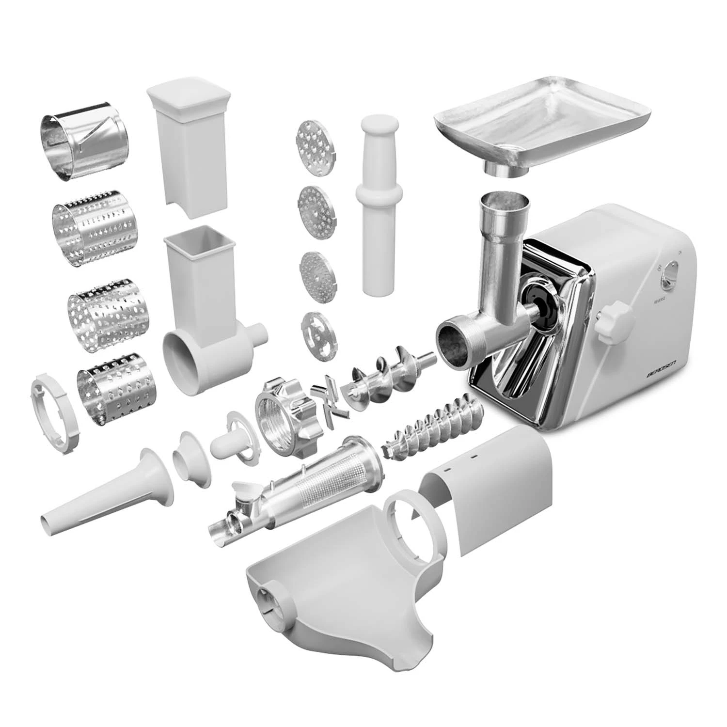 Апарат оснащений насадкою м’ясний, східною насадкою та потужним шнеком, який ретельно перемелює їжу.