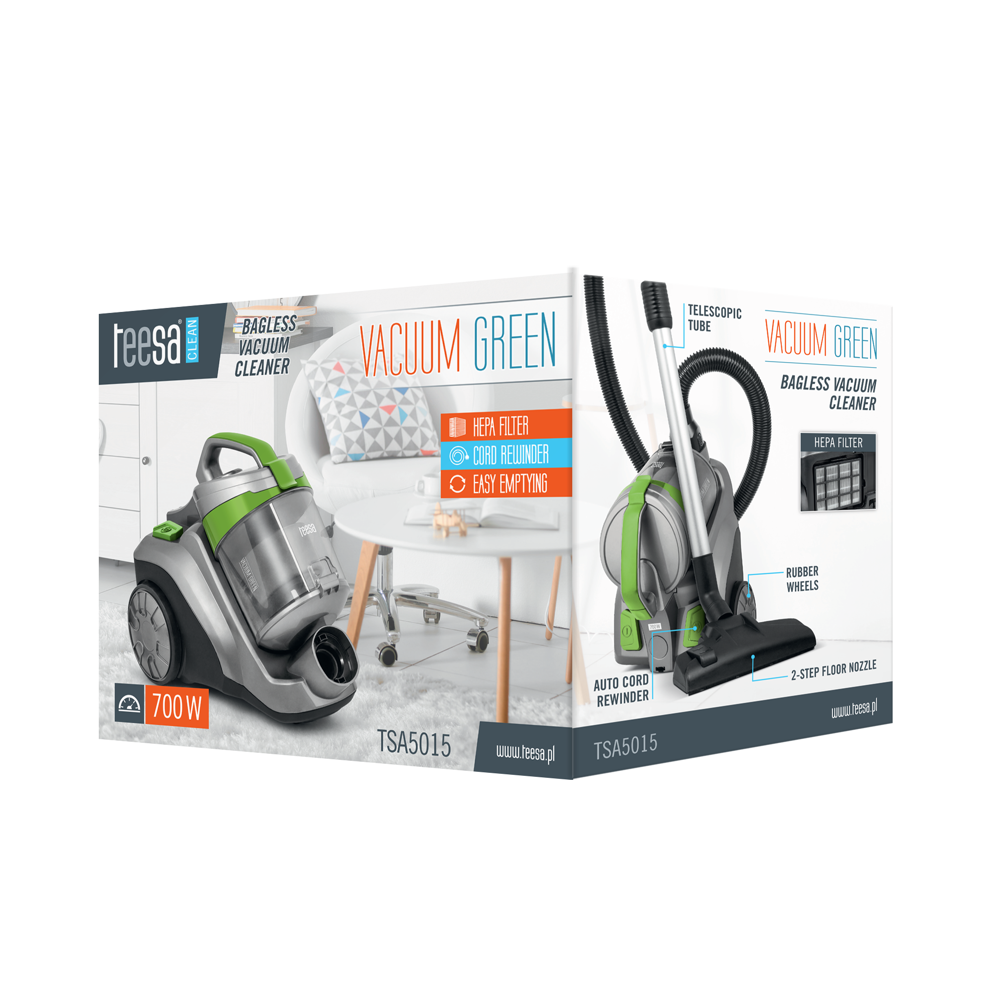 Пилосос без мішка Teesa VACUUM GREEN TSA5015- високоякісний без мішковий пилосос, оснащений потужним двигуном 700 що збереже вашу квартиру чистою. Клас ефективності пилососу твердої підлоги – А, що гарантує, що пристрій легко збирає пил із щілин між плиткою та дерев’яними поверхнями.