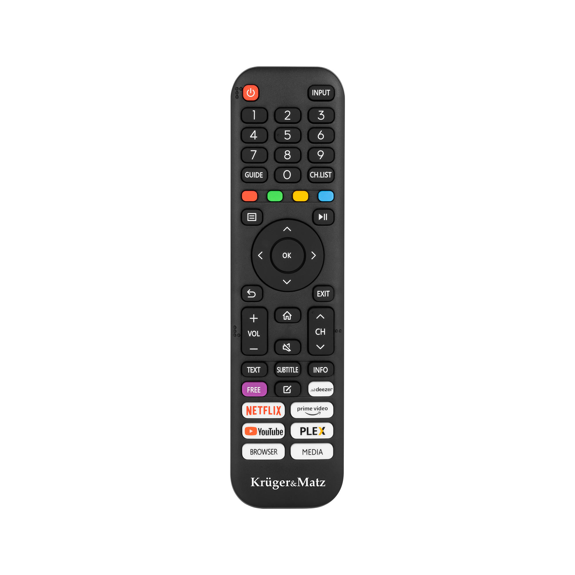 Пульт дистанційного керування, що входить до комплекту поставки телевізора Kruger & Matz, розроблено для зручного та інтуїтивно зрозумілого використання. Пульт дистанційного керування має ярлики для найпопулярніших програм, таких як Netflix, YouTube і Amazon Prime Video. Завдяки їм ви можете швидко запускати свій улюблений контент без необхідності переглядати меню або шукати програми.