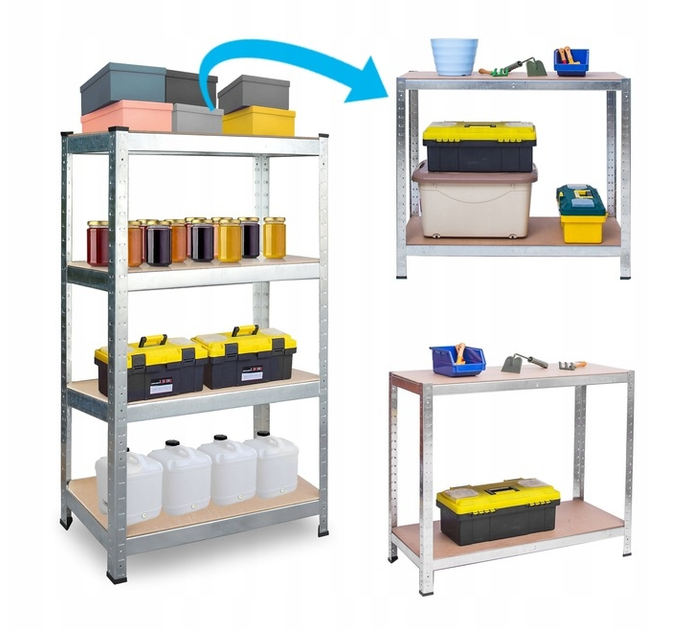 Стелаж складається з 4 полиць, на яких можна розмістити продукти, коробки або пристрої, з максимальним навантаженням до 150 кг на кожну полицю .