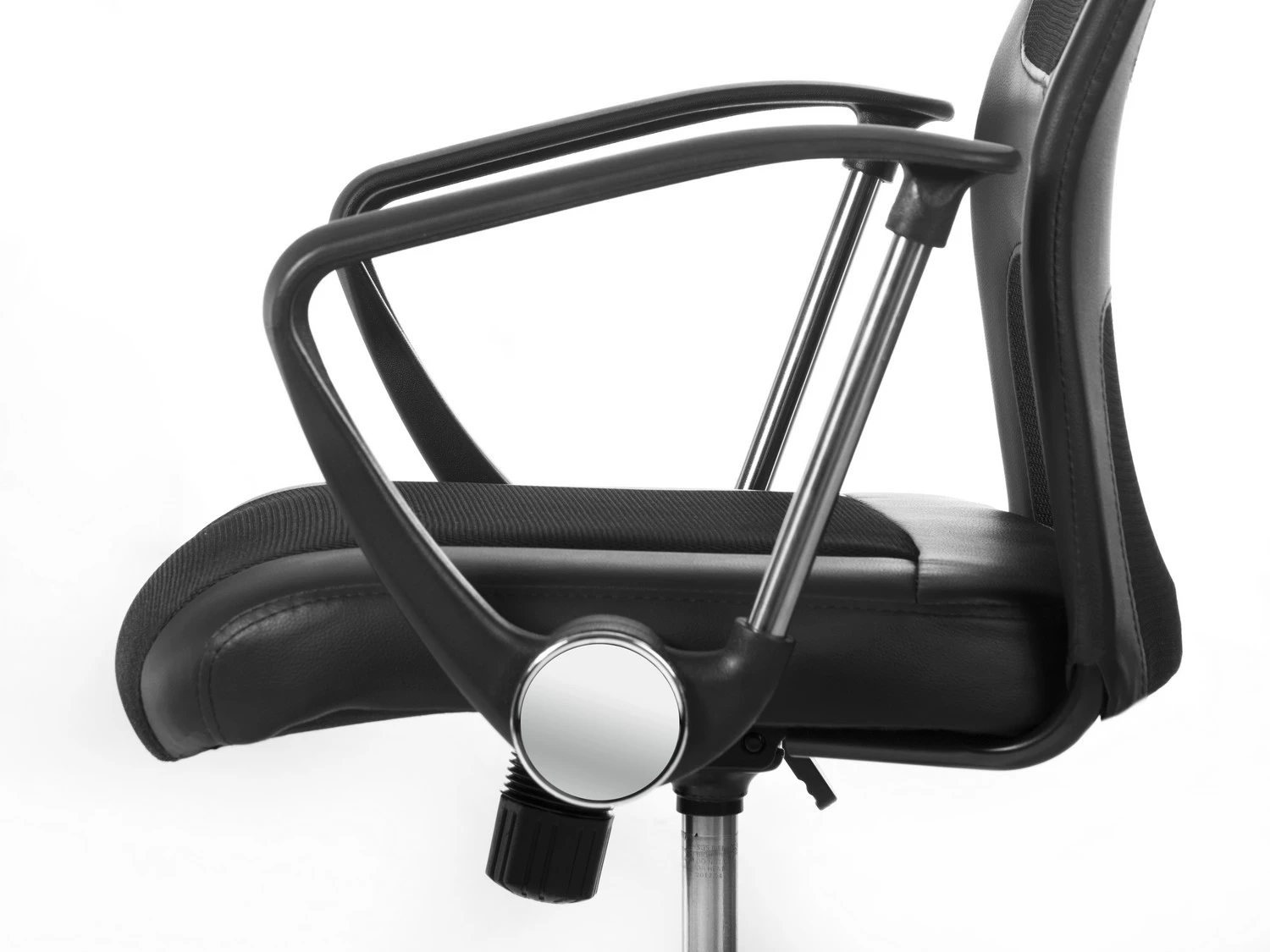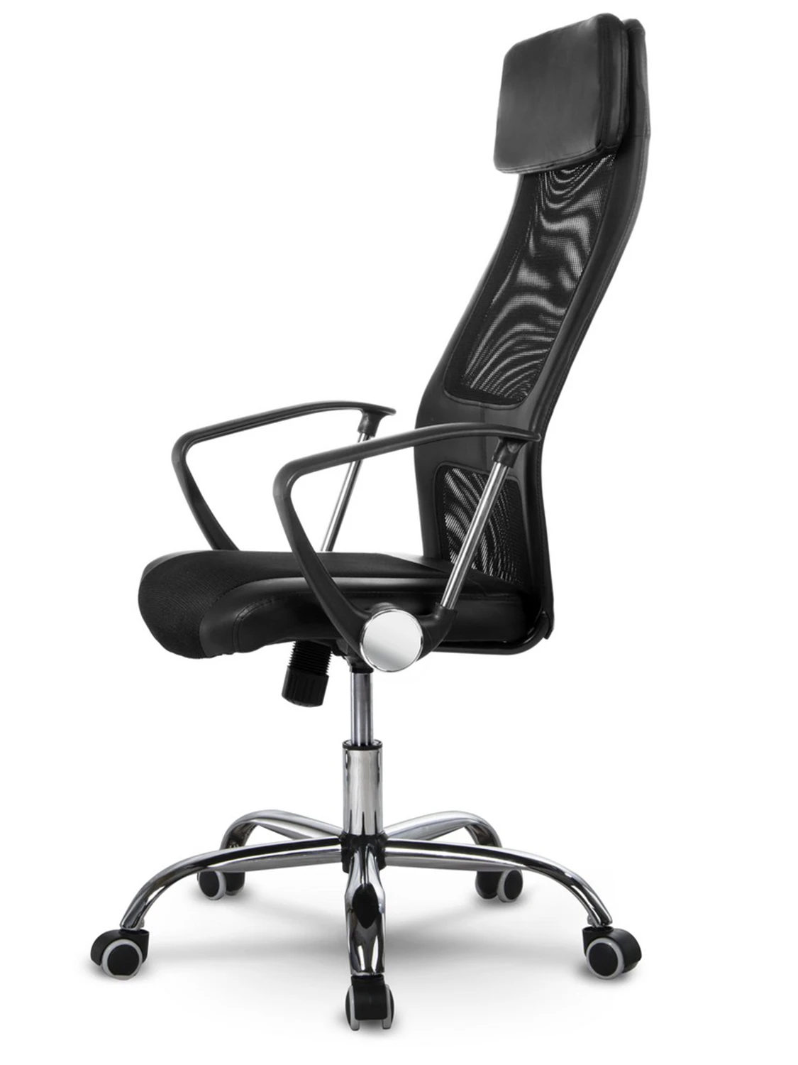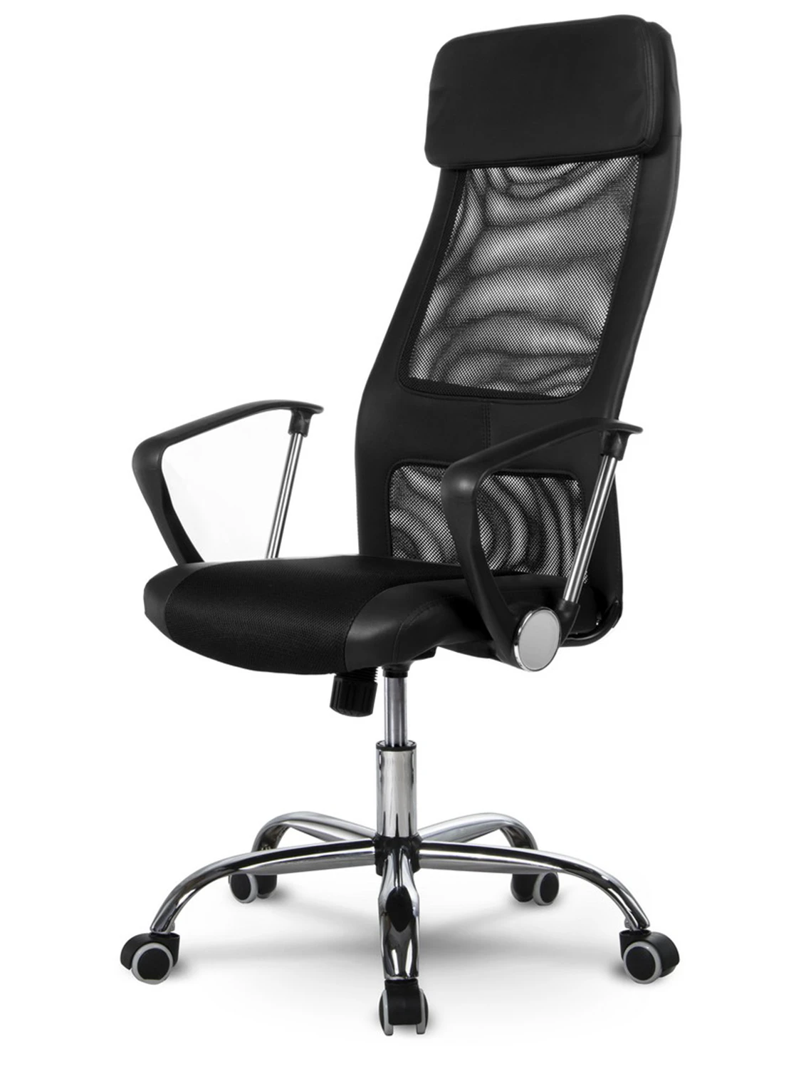 Високе крісло з мікросітки з хромованою основою.