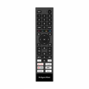 Пульт дистанційного керування, що входить до комплекту поставки телевізора Kruger & Matz, розроблено для зручного та інтуїтивно зрозумілого використання. Пульт дистанційного керування має ярлики для найпопулярніших програм, таких як Netflix, YouTube і Amazon Prime Video. Завдяки їм ви можете швидко запускати свій улюблений контент без необхідності переглядати меню або шукати програми.