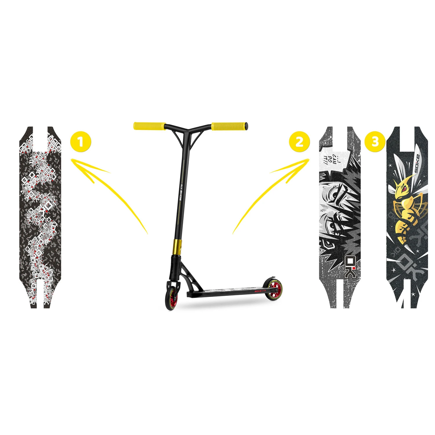 - Самокат поставляється з попередньо встановленою однією з представлених наклейок (вибирається випадково, вибір неможливий).